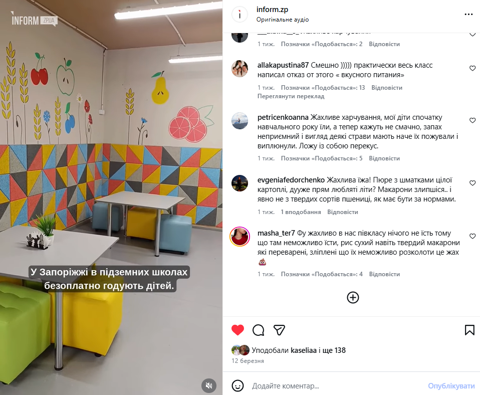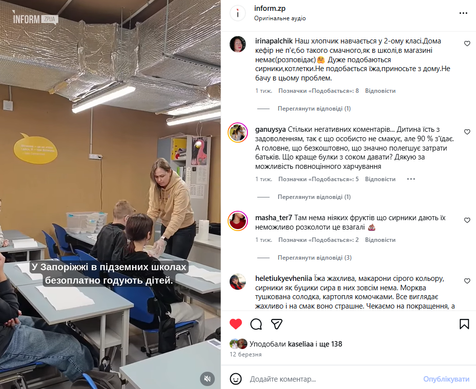 “У меня ребёнок учится в Запорожье в подземной школе, их кормят, но еда такая, что он её не ест, говорит ужасная, холодная. Поэтому носит с собой ланчбокс из дома. Единственное, что вкусное — это сырники”.