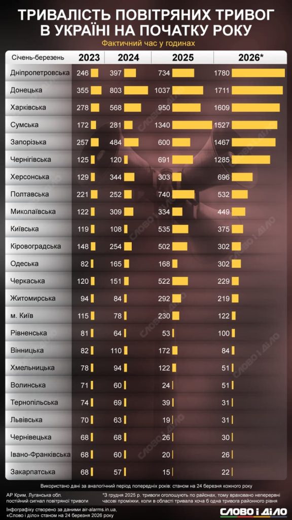 В период с 1 января по 24 марта 2026 года антирейтинг возглавила Днепропетровская область — там тревоги суммарно длились 1780 часов. Второе место занимает частично оккупированная Донетчина (1711 часов), третье — Харьковщина (1609 часов).