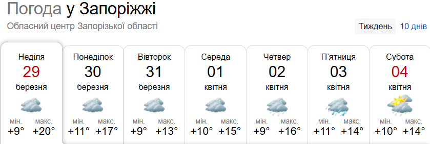 По данным Sinoptik.ua, ближайшая неделя в Запорожье отметится температурными качелями от +9°C ночью до +17°C днем. Переходный период между мартом и апрелем будет преимущественно пасмурным, а ближе к выходным в город придет дождевой циклон.