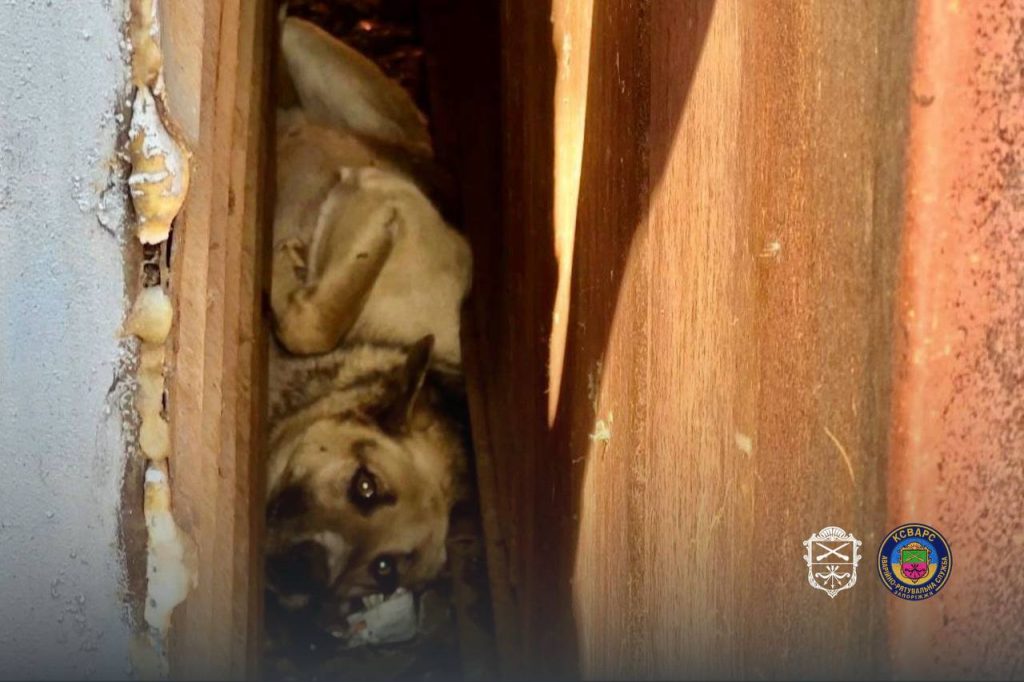 Жители Запорожья обратились за помощью к спасателям из-за собаки, попавшей в ловушку между гаражами.