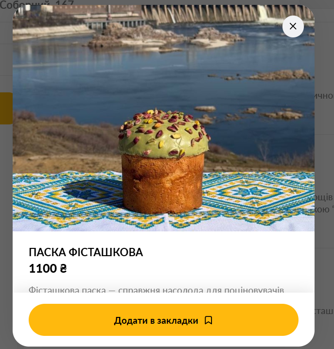 Ресторан «Ciao Ragazzi» предлагает одни из самых дорогих пасок в Запорожье. Классическая паска стоит 650 гривен за полкилограмма, маленькая — 280 гривен. Также есть другие вкусы: клубничная, фисташковая, рафаэлло. Такие позиции стоят от 1000 до 1100 гривен за 700 граммов.
