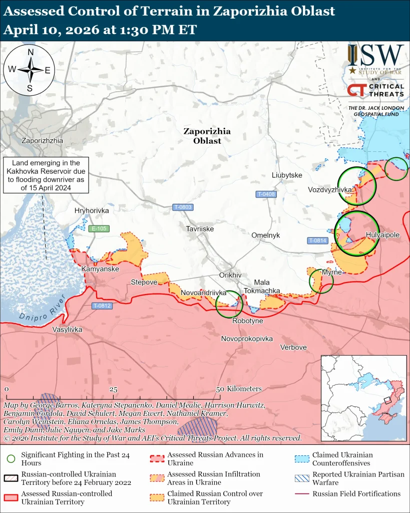 Российские войска 9–10 апреля атаковали на нескольких участках возле Гуляйполя. В частности, возле самого города, в районах Доброполья, Варваровки, Чаривного и Железнодорожного. Также бои продолжались на Ореховском направлении: возле Орехова, Степногорска и Приморского. Как пишет ISW, продвинуться оккупантам не удалось.