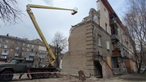 Коммунальщики начали подготовку жилого многоквартирного дома на ул. Сталеваров к этапу “консервации”. Дом частично разрушили российские ракеты осенью 2022 года.