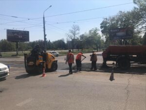 В Вознесенском районе на трамвайном переезде на перекрестке улиц Лермонтова и Независимой Украины. Коммунальщики укладывают новый асфальт. Работы выполняют без …