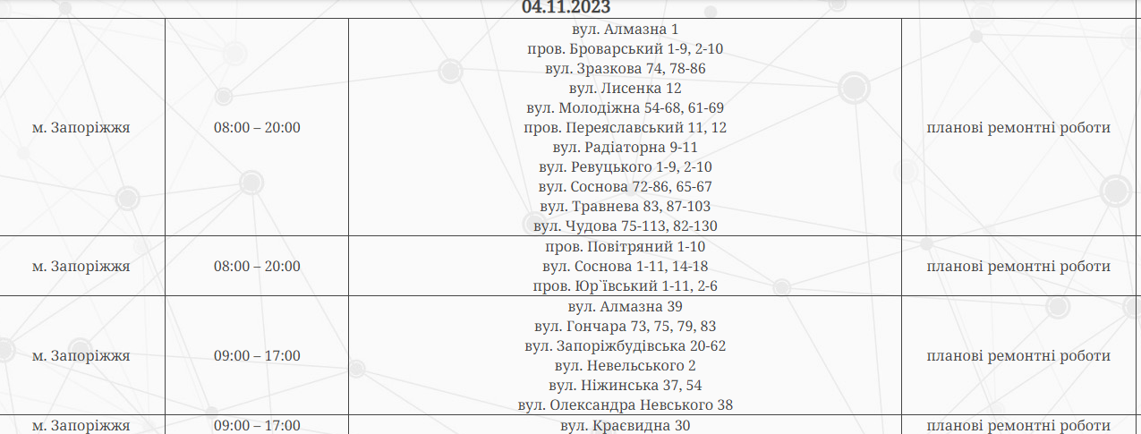 У Запоріжжі за деякими адресами сьогодні відключатимуть електроенергію. Це пов’язано з технічним обслуговуванням електрообладнання та плановими ремонтними роботами.