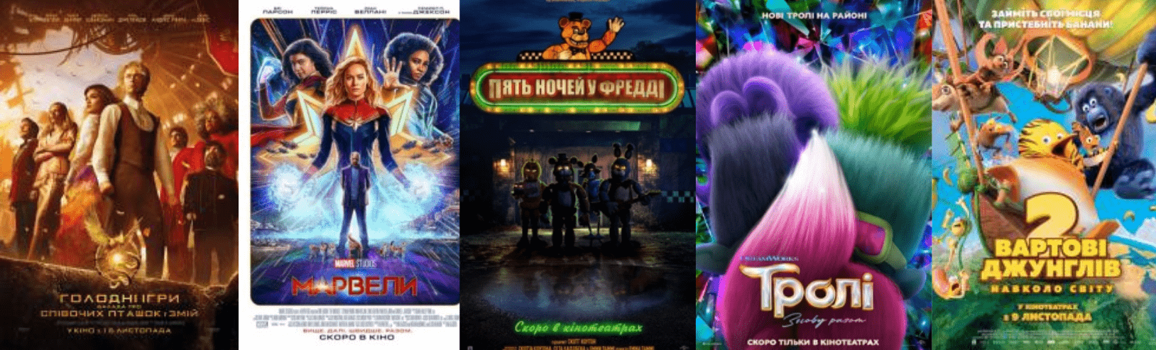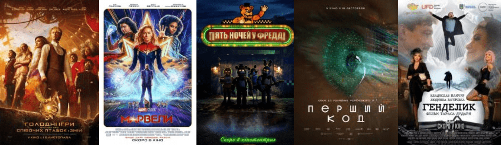 На сьогодні в прокаті доступні п’ять фільмів: “Голодні ігри: Балада про співочих пташок і змій”, “Марвели”, “П’ять ночей у Фредді”, “Тролі: Знову разом”, “Перший код”.