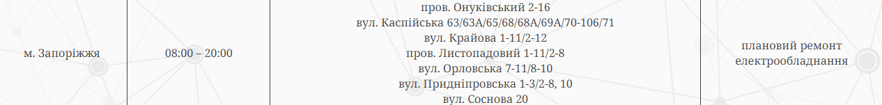 У Запоріжжі за деякими адресами сьогодні будуть відключати електроенергію. Це пов’язано з плановими ремонтними роботами.