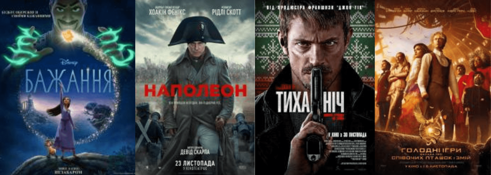 На сьогодні в прокаті доступні чотири фільми: “Бажання”, “Наполеон”, “Тиха ніч” та “Голодні ігри: Балада про співочих пташок і змій”.