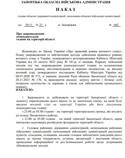 Із 30 листопада на території Запорізького району та міста Запоріжжя комендантська година триватиме з 23.00 до 05.00 години.