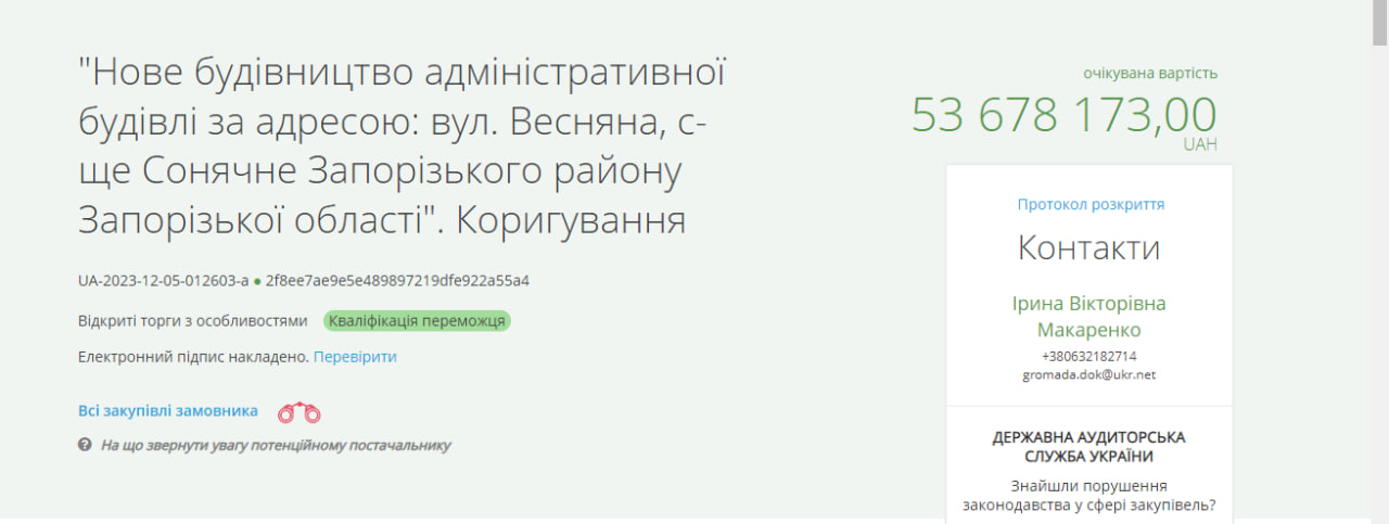Протягом 2024 року в селищі Сонячне підрядник має збудувати адміністративну будівлю вартістю в 53,6 мільйонів гривень, як зазначив замовник.