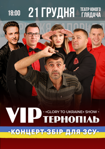 VIP Тернопіль – неодноразові переможці шоу “Розсміши коміка” та призери “Ліги сміху”. Тернопіль у рамках благодійного туру Україною на підтримку ЗСУ приїде до Запоріжжя з новою концертною програмою “Glory to Ukraine”.
