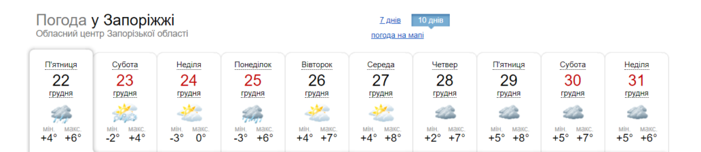 У суботу на всій території країни можливий невеликий мокрий сніг, на півдні та південному сході — сніг із дощем. День буде хмарним, але вельми теплим як для кінця грудня: у більшості регіонів очікується близько 0 °С, у східних і південних областях — +3…+5 °С (навіть уночі термометри покажуть близько +3 °С). Однак через підвищену вологість відчуватиметься холодніше, тому рекомендуємо одягатися тепліше і не забувати рукавички.