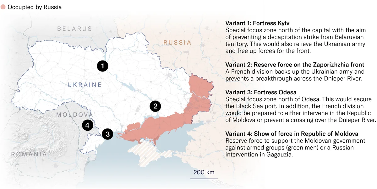 Однак набагато більш імовірним є вибіркове розгортання в критичний момент з метою запобігання перемоги росії. Франція дотримується стратегії “переконування”: опонента слід “відмовити” від наступного кроку. Французькі сухопутні війська в Україні будуть діяти як передова розтяжка для Кремля, а їхні власні сили оборони будуть загрозливим фоном.