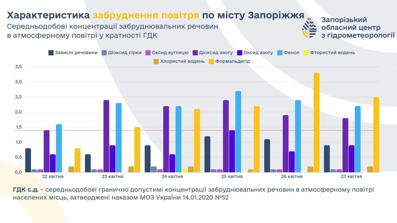 Минулого тижня концентрації забруднювальних речовин у повітрі Запоріжжя були перевищені за наступними домішками: