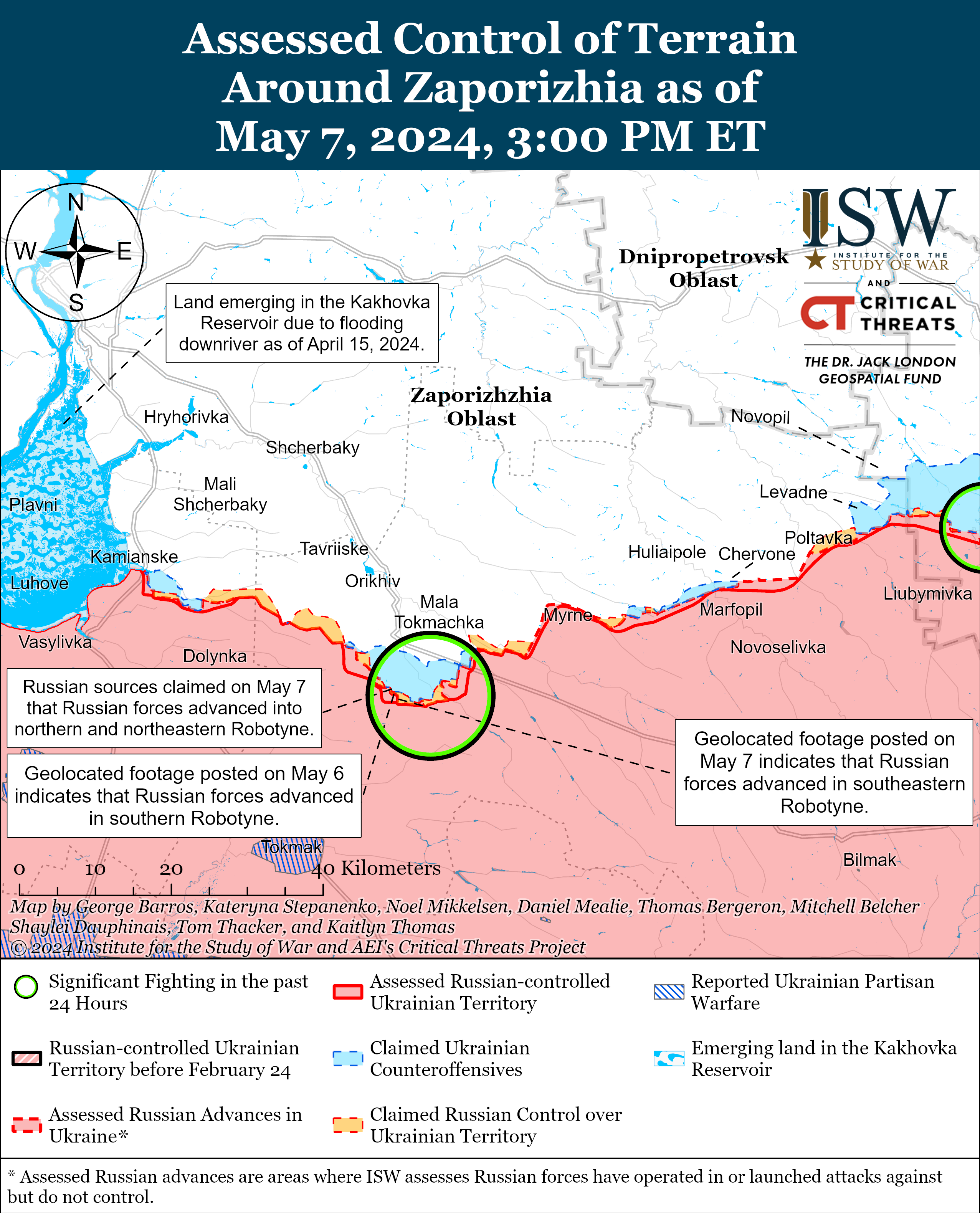 Російські війська підтвердили наступ у західній частині Запорізької області на тлі триваючих позиційних боїв. Геолокаційні кадри показують, що російські війська просунулися на південь від Роботиного.