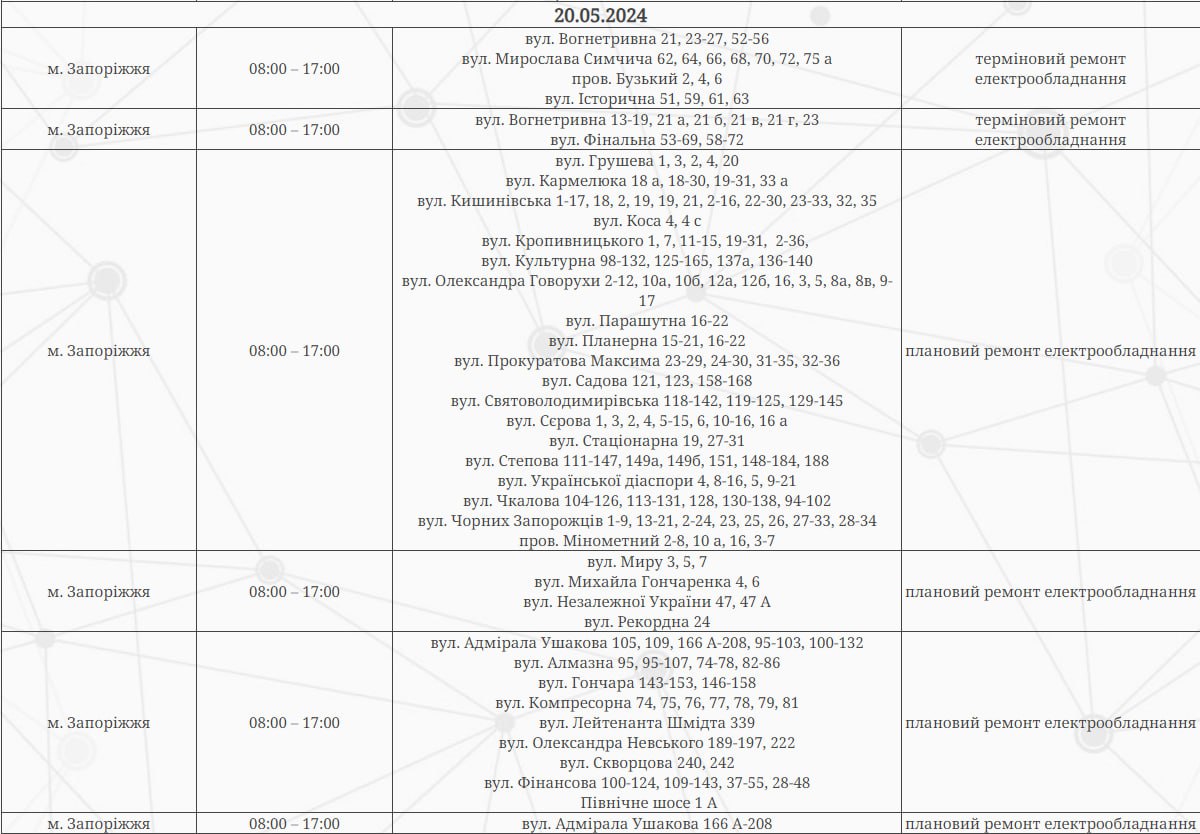 У Запоріжжі за деякими адресами сьогодні, 20 травня, будуть відключати електроенергію. Це пов’язано з плановими та терміновими ремонтними роботами.