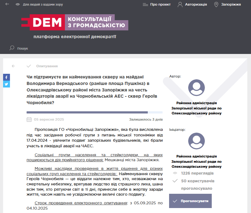 Опитування стартувало 5 вересня. Станом на зараз участь у ньому взяли 50 містян. Ініціатором виступила районна адміністрація Запорізької міської ради по Олександрівському району.