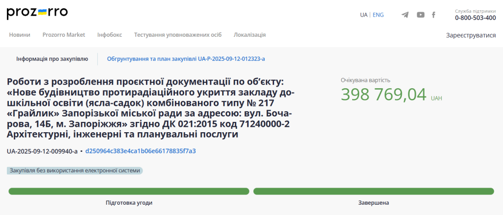 Тендер на розробку проєктної документації. Скриншот з порталу “Prozorro”