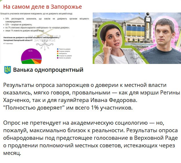 Допис телеграм-канала “На самом дєлє в Запорожьє” від 8 жовтня стосувався запорізької місцевої влади і спирався на опитування щодо загального відношення до неї мешканців міста. У телеграм-каналах окупаційної влади періодично з’являються дописи про представників запорізької влади, зокрема, голови Запорізької ОВА Івана Федорова і в.о. міського голови Регіни Харченко. У авторів цих дописів дуже гаряча стадія ненависті до цих посадовців. Ці дописи, зазвичай, переповнені ненавистю, образами, приниженнями, цькуванням, класичною хейтерською лексикою і вкладаються в пропагандистський наратив про нікчемну українську владу і її нікчемних представників. В основному, у таких дописах пропагандисти використовують тексти журналістів задля дискредитації статусу і посад представників влади, у тому числі, запорізької. Цього разу допис також не відрізнявся оригінальністю.