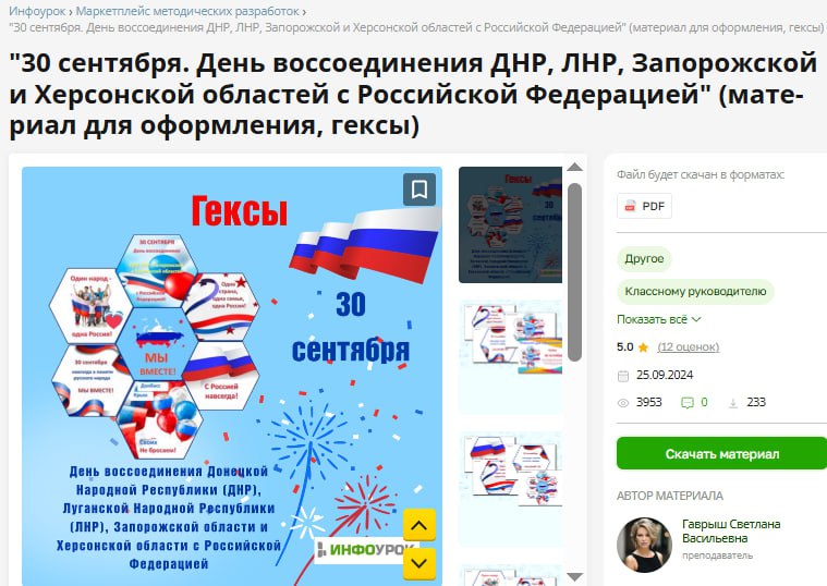 Але продовжимо з Тіртеєм. На російському маркетплейсі “Інфоурок”, куди російські педагоги викладають свої методичні розробки, легко знайти інформацію про те, що Тіртея і його вірш “Добре помирати тому…” вивчали і в російських школах. Наприклад, в одному з планів уроку йдеться про таке: “Тема. Особливості розвитку і види лірики у Давній Греції. Тіртей. “Добре помирати тому”. Ідея захисту рідної країни в елегії. Античний ідеал героя. Авторська позиція.” Якщо цей план уроку датований 2021 роком, то, наприклад, у 2024 році тут можна знайти методичну розробку для класних керівників “Вибори Президента Росії 2024” або методичні рекомендації за 2025 рік “30 вересня. День возз’єднання ДНР, ЛНР, Запорізької та Херсонської областей з Російською Федерацією” (матеріал для оформлення, гекси)”.