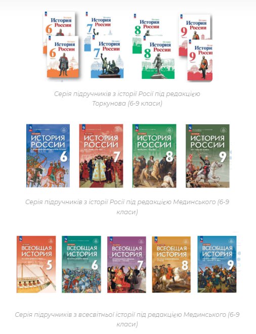 Але це тільки окремі приклади пропагандистської складової, націленої на підтримку війни проти України, яка впроваджується в російській освіті. З початку повномасштабного вторгнення були перероблені базові підручники, за якими навчаються російські діти. Окреме місце в них займають підручники з історії для 6-9 класів, написані одним з провідних ідеологів рашизму, помічником президента РФ Володимиром Мединським. За ними діти, в тому числі на окупованих територіях, почали навчатися з 1 вересня 2023 року. По суті, це “підручники ненависті”, зокрема до України, США, НАТО і всього “колективного Заходу” з допомогою маніпуляцій, відвертих фейків і конспірології.
