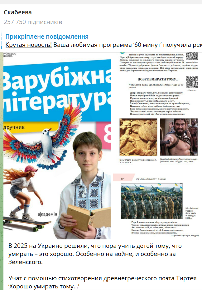 Ще одною маніпуляцією сенсами став допис про “примус українських дітей йти на війну за Зеленського”. Пропагандисти періодично намагаються включити у власну повістку тематику освіти українських дітей. Зазвичай, таких дописів в окупаційних телеграм-каналах запорізького регіону небагато. Втім, цього тижня, скоріше за все, з подачі російської пропагандистки Ольги Скабєєвої, по локальним телеграм-каналам рознесли чергову “зраду” української освіти. Так, 9 жовтня вона, а за нею і локальний телеграм-канал “На самом дєлє в Запорожьє” звинуватили українську освіту, зокрема, авторів підручника 8 класу “Зарубіжна література”, що вони привчають “дітей до того, що помирати у війні за Зеленського – це добре”. “Батьки учнів 8 класів (та інших) показали, які вірші змушують навчати дітей сьогодні за часів режиму Зеленського та міністра Лісового. Вірш давньогрецького поета Тіртея «Добре вмирати тому…» ілюстрований ЗСУшниками, щоб натяк зрозумілий був кожному. Готують молоде м’ясо на вічну війну. Поки що діти еліти всі за кордоном”, – йдеться у дописі.