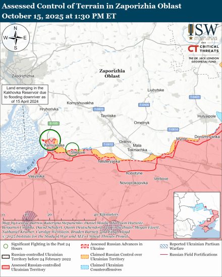 ISW також повідомляє, що російські піхотні та безпілотні підрозділи продовжують діяти вздовж траси Т-0408 Новоданилівка–Оріхів, а українські війська проводять контратаки в районах Приморського та Степногірська.