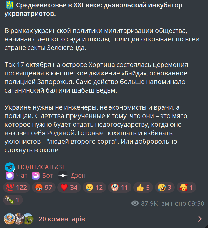 20 жовтня окупаційні телеграм-канали поширили недостовірну інформацію про посвяту школярів до юнацького патріотичного руху «Байда», яка напередодні відбулася у Запоріжжя. У публікації захід назвали «сатанинським балом» і «сектой Зелеюгенда». Насправді ж на острові Хортиця відбулася урочиста церемонія посвяти за участі молоді, поліції, влади та ветеранів, спрямована на виховання громадянської свідомості, відповідальності й любові до України.