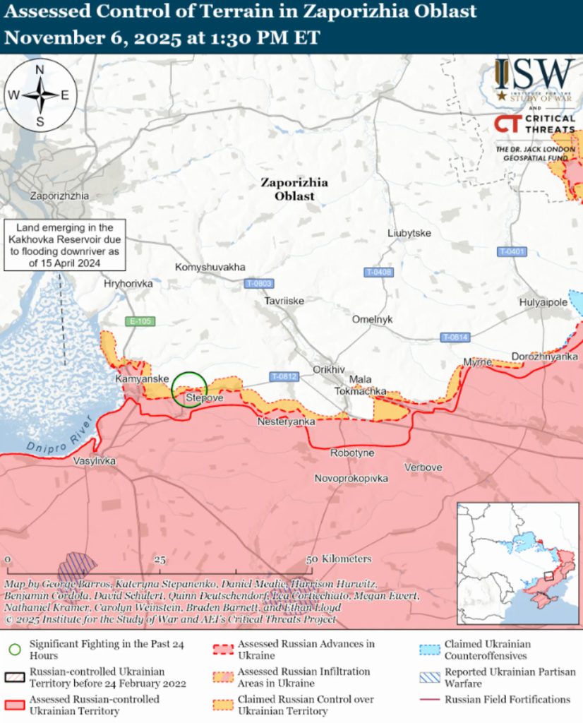 Російські війська 6 листопада продовжили наступальні дії на гуляйпільському напрямку, але не змогли просунутися. Українські військові утримують позиції, попри посилення ударів авіацією, артилерією та дронами.