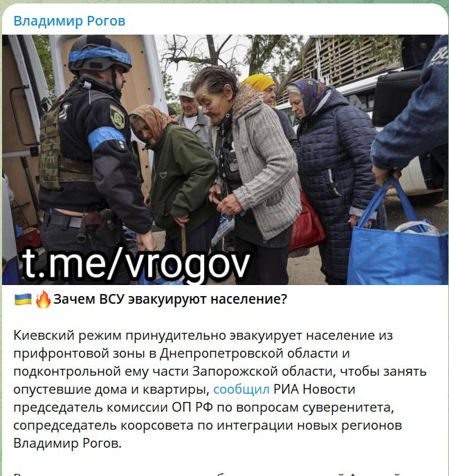 17 листопада в телеграм-каналі “Владімір Рогов” з аудиторією понад 100 тисяч підписників з’явився допис “Навіщо ЗСУ евакуюють населення?”. У ньому стверджується: “Київський режим примусово евакуює населення з прифронтової зони у Дніпропетровській області та з підконтрольної йому частині Запорізької області, щоб зайняти військовими спорожнілі будинки та квартири”. Цю заяву він не просто розмістив у власному телеграм-каналі, а процитував себе з РІА Новості, яке розповсюдило фейкову інформацію в новинній стрічці.