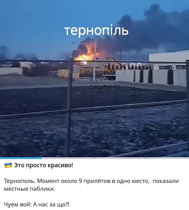 “Це просто красиво! Тернопіль. Момент близько 9 прильотів в одне місце показали місцеві паблики. Чуємо виття: А нас за що?”.