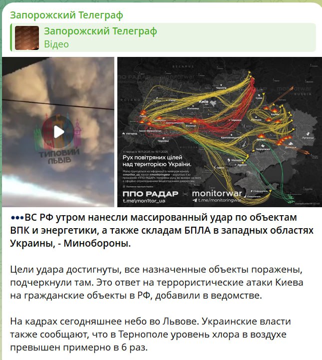 “ВС РФ вранці завдали масованого удару по об’єктах ВПК та енергетики, а також складів БПЛА у західних областях України, – Міноборони. Цілі удару досягнуто, всі призначені об’єкти вражені, наголосили там. Це відповідь на терористичні атаки Києва на цивільні об’єкти у РФ, додали у відомстві. На кадрах сьогодні небо у Львові. Українська влада також повідомляє, що у Тернополі рівень хлору в повітрі перевищено приблизно у 6 разів”.