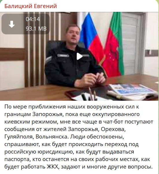 “У міру наближення наших збройних сил до кордонів Запоріжжя, поки що окупованого київським режимом, мені все частіше до чату надходять повідомлення від мешканців Запоріжжя, Орєхова, Гуляйполя, Вільнянська. Люди стурбовані, запитують, як відбуватиметься перехід під російську юрисдикцію, як видаватимуться паспорти, хто залишиться на своїх робочих місцях, як працюватиме ЖКГ, ставлять і багато інших питань”.