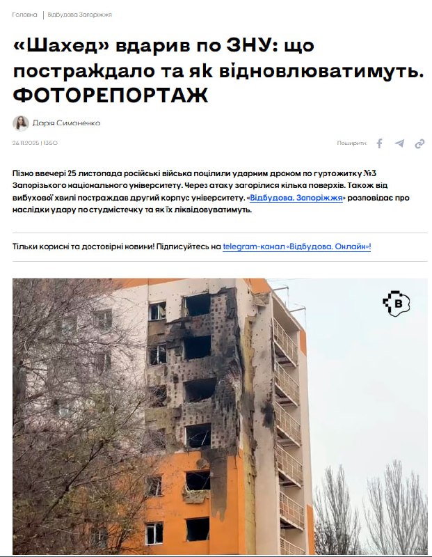 Російські атаки на Запоріжжя стають інтенсивніше і жорстокіше. 20 листопада у наслідок російської атаки у місті загинуло п’ятеро людей – ракети поцілили в магазин, будинок і ринок. Пізно ввечері 25 листопада Запоріжжя зазнало одну з наймасовіших шахедних атак останнього часу: 11 ударів в трьох районах Запоріжжя, понад 50 будинків, в тому числі, будівля студентського гуртожитку, пошкодило, згоріли автівки, 19 людей постраждало. Цієї ночі російські окупанти обстрілом пошкодили і будівлю “Суспільне Запоріжжя”. Постраждала і квартира журналіста-розслідувача Сергія Сидорова. А ще в обласному центрі запроваджені тривалі відключення світла – іноді його немає по 18 годин. Це – вже звичні умови, в яких працюють запорізькі журналісти і журналістки.