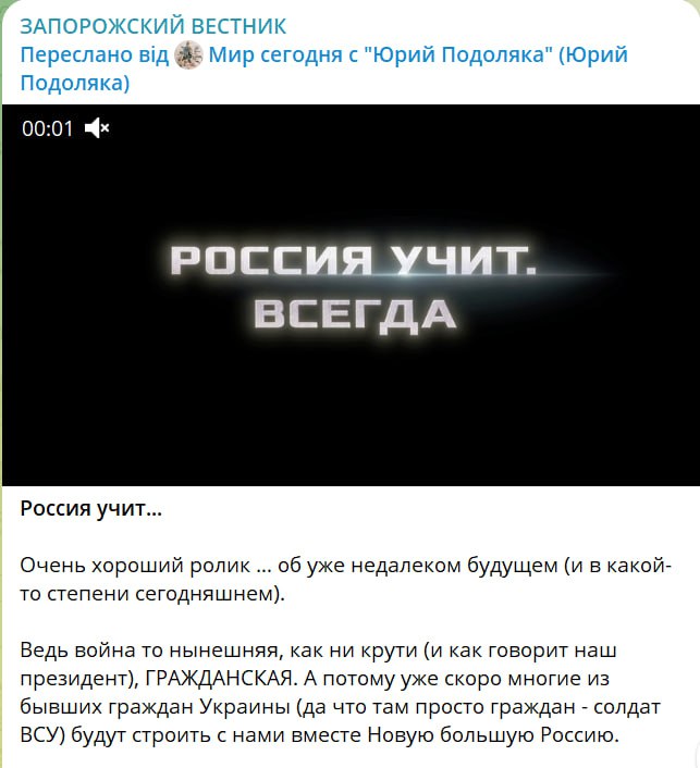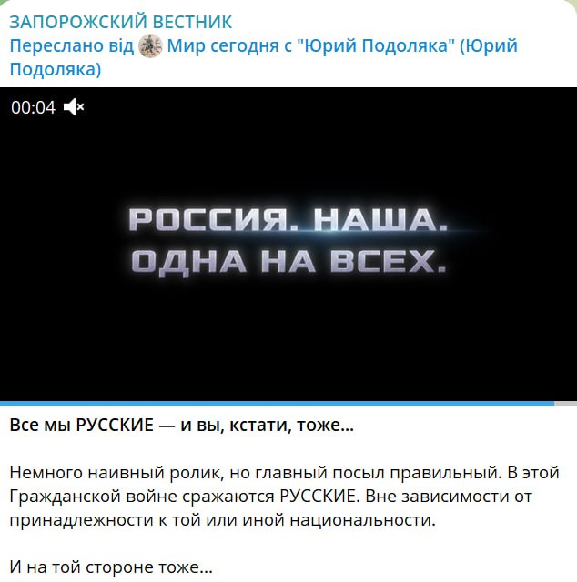 “Запорожскій вєстнік” підписує відео, знову акцентуючи увагу на “громадянській війні” і повністю знищуючи українську ідентичність як таку заявою: “У цій громадянській війні борються руські. Незалежно від приналежності до тієї чи іншої національності. І на тому боці теж”.