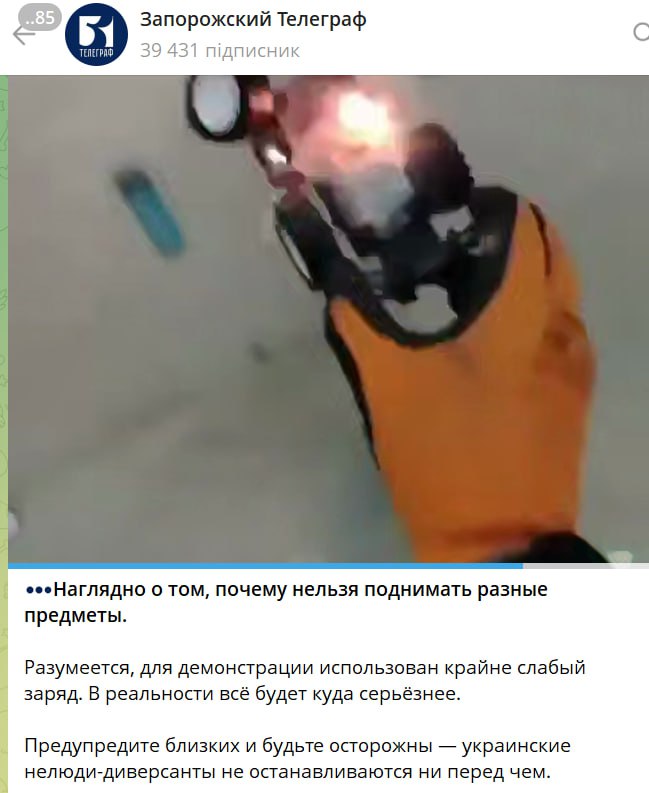 Крім постійної демонізації і звинувачень військових ЗСУ у нібито цілеспрямованих атаках на цивільні об’єкти і людей на ТОТ, цього тижня пропагандисти розповсюдили ролик-пояснення про вибухівку у побутових речах, які, за їх твердженням, виробляють “українські диверсанти”. Так, телеграм-канал “Запорожскій тєлєграф” 28 листопада оприлюднив ролик, на якому демонструють, що і як можна підірвати. У підписі до повідомлення йдеться: “Наочно щодо того, чому не можна піднімати різні предмети. Зрозуміло, для демонстрації використано дуже слабкий заряд. Насправді все буде набагато серйозніше. Попередьте близьких і будьте обережні – українські нелюди-диверсанти не зупиняються ні перед чим”.