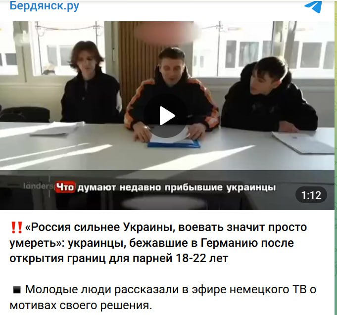 Так, телеграм-канал “Бердянск.ру” 28 листопада оприлюднив відео, яке може належати німецькому виданню ZDF, на якому показані три хлопця, які сидять за столом, і потім по черзі розповідають про те, чому вони покинули Україну. Наприклад, 22-річний Олексій говорить: “Це маячня (що саме маячня, не пояснюється, – авт). Ми тільки вмираємо. Ми вмираємо. Росія сильніша за Україну. І неважливо, це тільки смерть”.