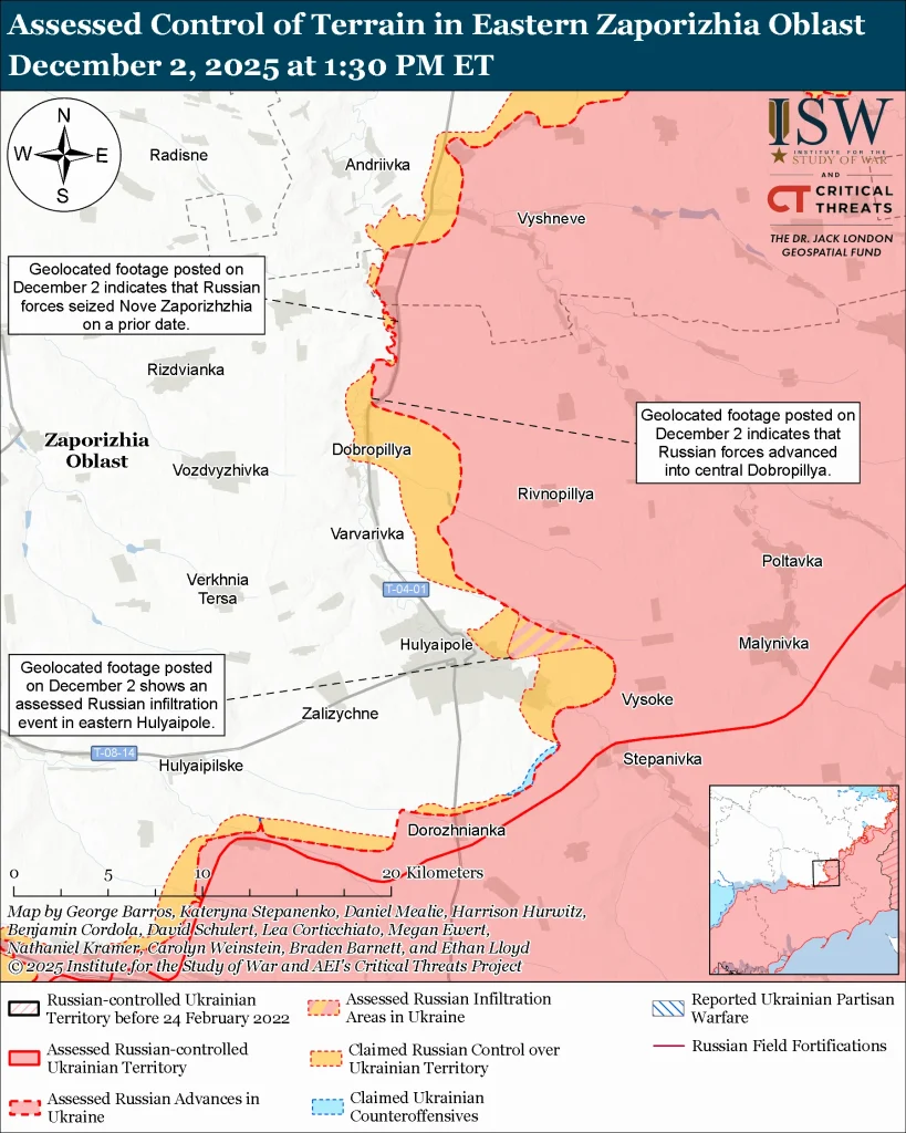 Карта бойових дій поблизу Гуляйполе, 2 грудня 2025. Фото: ISW
