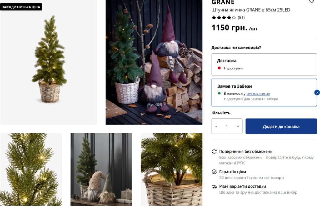У мережі «JYSK» також широкий вибір штучних ялинок різних форм, розмірів та стилів.