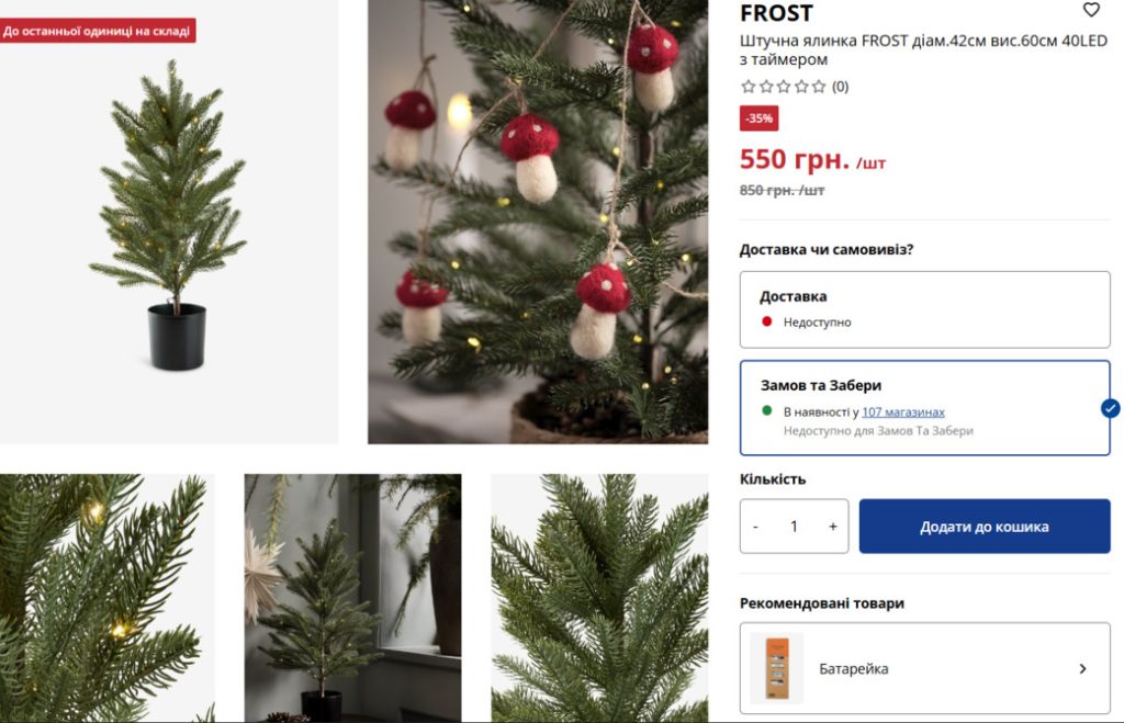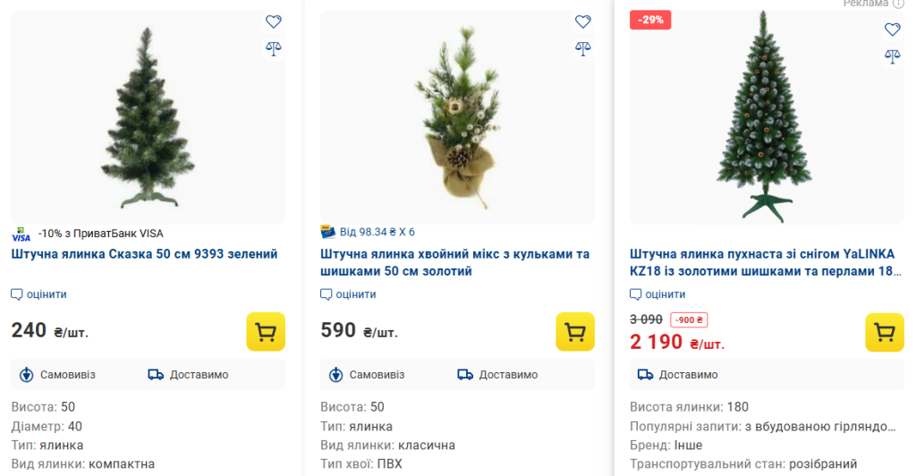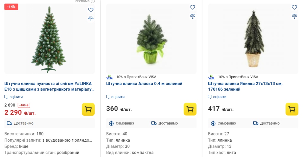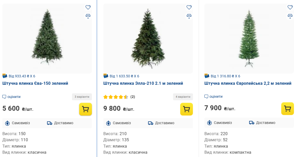 - Штучна ялинка Елла-210, 2,1 м — 9800 грн. Це одна з найдорожчих ялинок магазину — велика, пишна й призначена для просторих квартир або офісів.