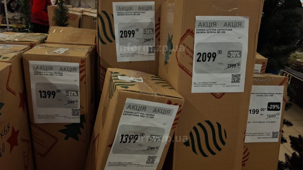 У запорізьких супермаркетах уже стартував сезон продажу штучних новорічних ялинок: попит стабільно зростає з кінця листопада, а магазини пропонують знижки та широкий вибір — від компактних декоративних дерев до великих «литих» моделей.