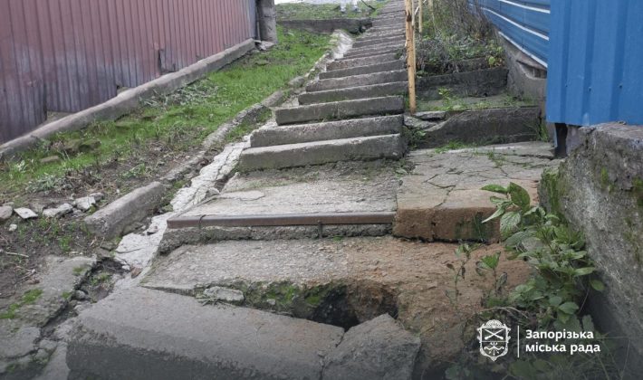 Наразі будівельники розпочали ремонт. За два тижні мають встановити нові сходи та перила. Під ними облаштують решітку для відведення дощової води, прочистять і розширять лоток, щоб потоки не розмивали конструкцію в майбутньому.