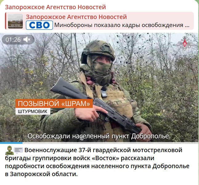 “Звільнення” Добропілля Запорізької області стало чи не топ-новиною дня для більшості окупаційних телеграм-каналів. Про це написали окупаційні ресурси телеграм-канали і окупаційні медіа “Новий Мелітополь”, “Запорожскій Телеграф”, “Владімір Рогов”, “Запорожскоє агєнтство новостєй”, “Хлєб Медіа” і “На самом дєлє в Запорожьє”. Причому “Запорожскоє агєнтство новостєй” опублікувало про це три дописи, в тому числі, як військовослужбовці 37-ї гвардійської мотострелкової бригади угруповання військ “Восток” розповідали про це “звільнення”.