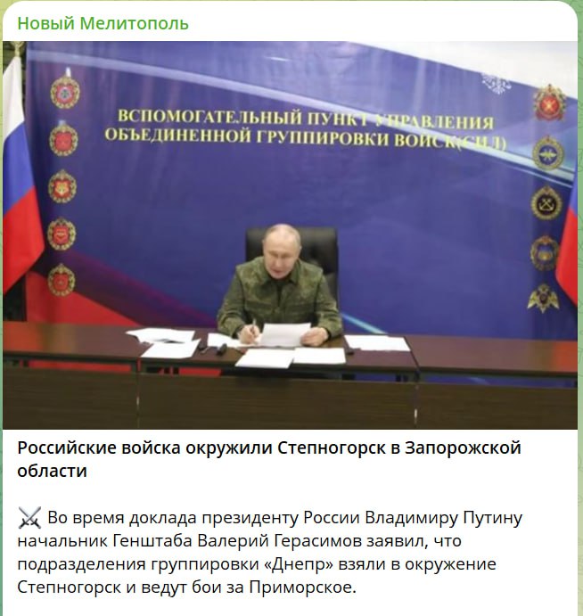 Минулого тижня російські пропагандисти анонсували ще одну псевдоперемогу, повідомивши про оточення Степногірська Запорізької області. Про оточення Степногірська також 2 грудня повідомили телеграм-канали “Новий Мелітополь”, “За!ТВ” і “Запорожскоє агєнтство новостєй”. За їхніми даними, фейк розповсюдив керівник російского генштабу Герасімов, коли робив доповідь диктатору Путіну. Він повідомив, що російські війська нібито оточили Степногірськ Запорізької області. Цю недостовірну інформацію підхопили і розповсюдили по локальних телеграм-каналах і медіа окупованих територій російські пропагандисти.