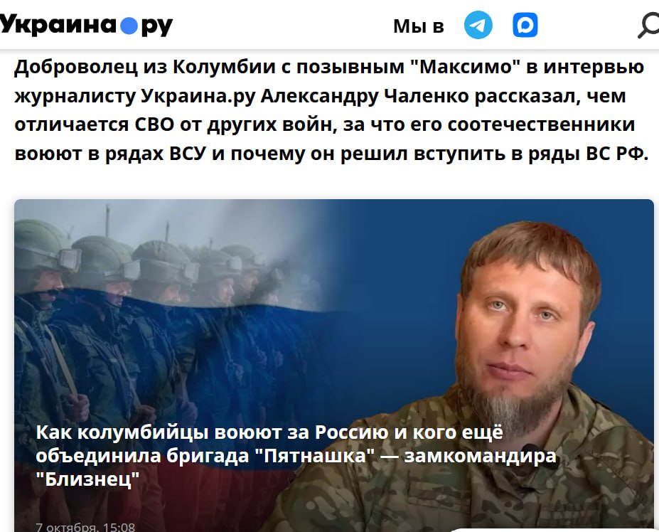 Вже кілька тижнів в окупаційних телеграм-каналах, які розповсюджують інформацію на тимчасово окупованих територіях України, пропагандисти пишуть про “найманців-колумбійців”, які нині тисячами служать на запорізькому напрямку. Цю інформацію вони підхопили після ряду повідомлень українських регіональних медіа з посиланням на Запорізьку обласну військову адміністрацію, яка розповіла про спільний проєкт обласної військової адміністрації, центрів рекрутингу бригад та обласного ТЦК. Як повідомили РІА Південь з посиланням на Запорізьку ОВА, колумбійці зараз служать у 65-й окремій механізованій бригаді “Великий Луг”. Вони стали частиною іноземного легіону, який допомагає тримати оборону проти окупантів.
