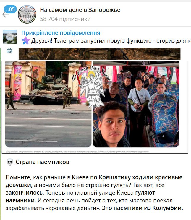 Тема колумбійців застосовується і для дискредитації ЗСУ. Зокрема, останніми тижнями пропаганда розкручує історію колумбійця, якого нібито українські військові не відпускають з позицій після закінчення контракту. Мало того, описують ситуацію в окупаційних телеграм-каналах, його побили і утримують десь на позиціях, відмовляючись платити. Така інформація з’явилася в 3 грудня телеграм-каналі “На самом дєлє в Запорожьє” .