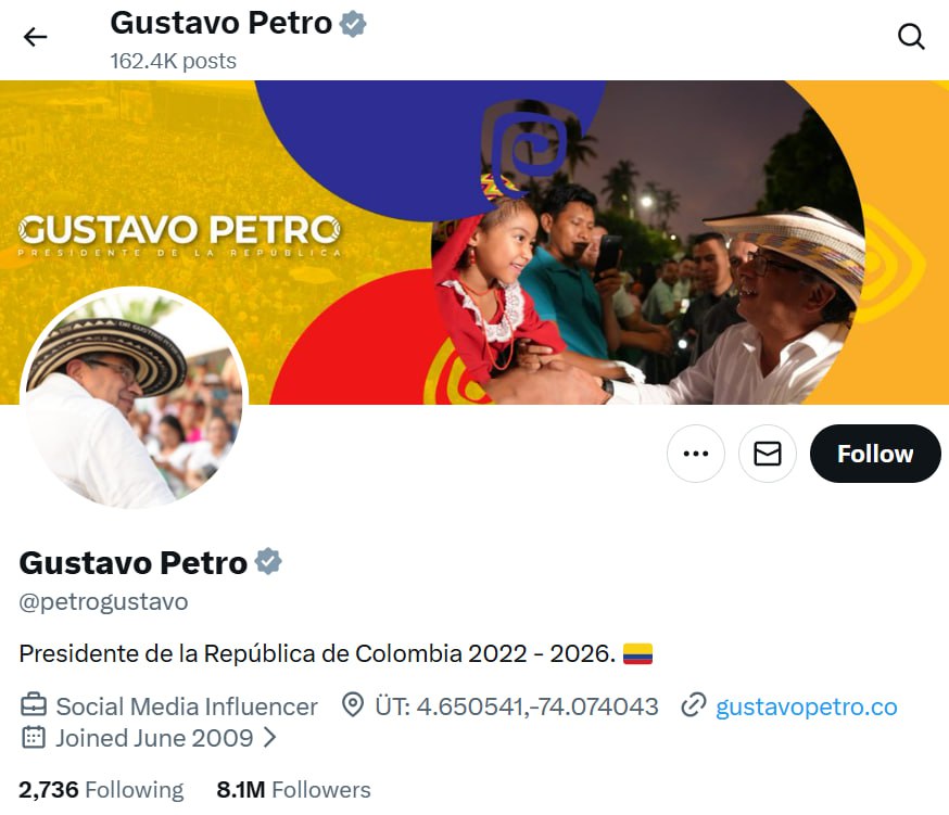 Допис, як і сторінка, викликає ряд запитань. По-перше, незрозуміло, як поєднуються ці дві теми – про “полон в Україні” і “військовий шпиталь для лікування дітей”. Також лінк на офіційний сайт Густаво Петро – не працює, такої сторінки просто не існує. До цього ж, локація цього акаунту в Х має таку адресу: ÜT: 4.650541,-74.074043, яку гугл карти визначають як обмальовану графіті будівлю в столиці Колумбії Боготі, в той час як офіційна резиденція президента знаходиться в цьому ж місті, в Каса де Наріньо, і має конкретну адресу.