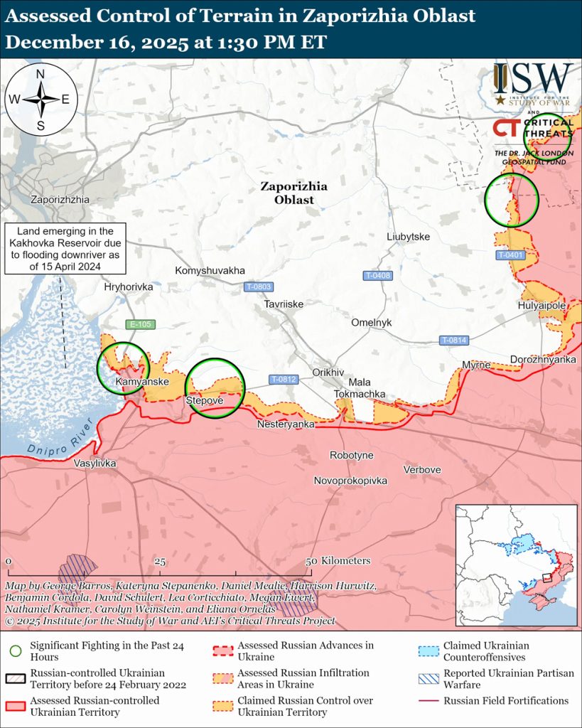 Російські війська 15–16 грудня намагалися наступати на Гуляйпільському та Оріхівському напрямках у Запорізькій області, але підтвердженого просування немає.