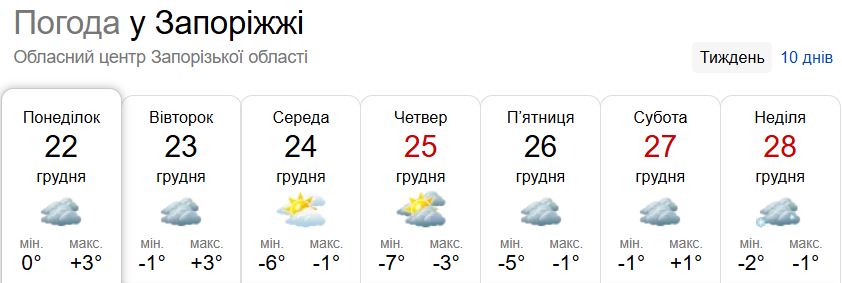 За даними Sinoptik.ua, найхолоднішим днем стане 25 грудня – Різдво, коли температура опуститься до -7°. Найтеплішими днями будуть 22 та 23 грудня (понеділок та вівторок), коли максимальна температура сягне +3°. Після різдвяних морозів очікується незначне потепління до +1°.