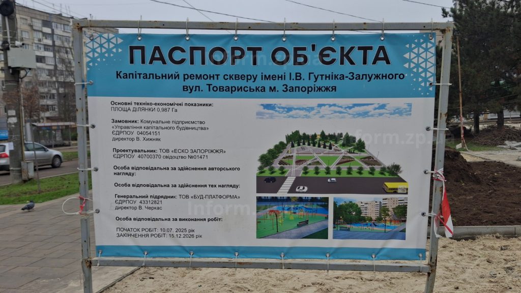 Роботи виконує Запорізьке міське комунальне підприємство «Управління капітального будівництва». Саме УКБ оголосило тендер на капітальний ремонт скверу імені І.В. Гутніка-Залужного — він був опублікований на платформі Prozorro 6 червня. Орієнтовна вартість проєкту становить понад 29 мільйонів гривень.
